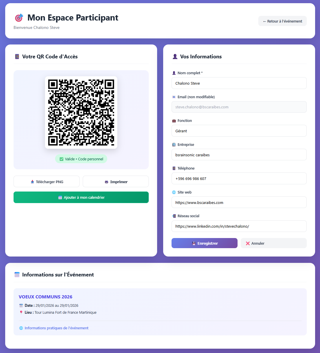 Depuis cet espace, il peut imprimer son invitation, ajouter l’événement à son calendrier, télécharger tous les documents utiles (programme, plan d’accès, etc.), mettre à jour ses informations… et bientôt bien plus encore !