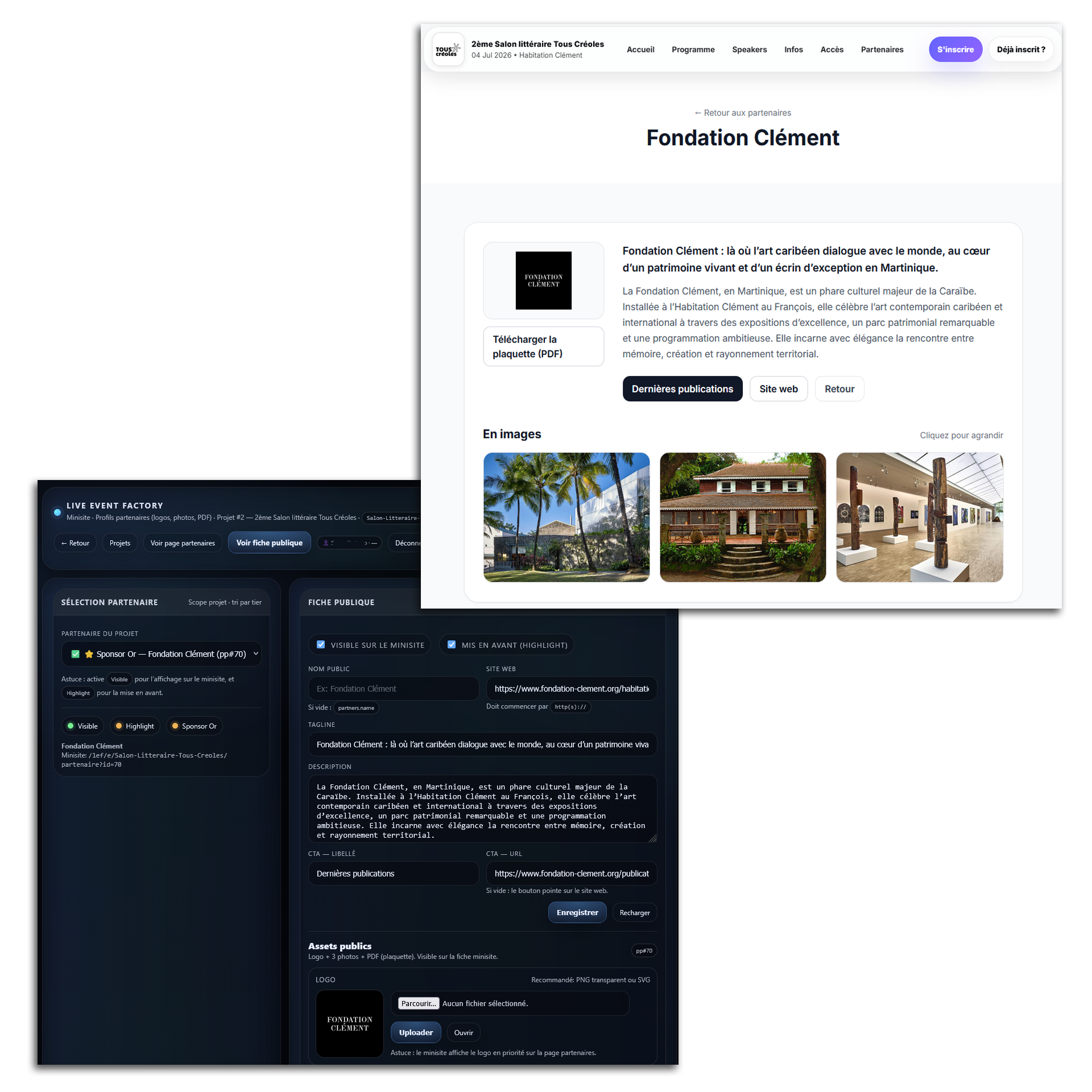 Live Event Factory transforme la gestion des partenaires en véritable levier de valeur pour vos événements, côté backoffice, vous pilotez la visibilité, la mise en avant (highlight), les contenus (logo, galerie photos, PDF, CTA) et la cohérence des fiches partenaires en quelques clics. Côté minisite, vos sponsors, partenaires et exposants ne sont plus de simples logos, chaque partenaire dispose d’une page riche, élégante et mobile-first, pensée pour la conversion (lien, appel à l’action, plaquette) et le rayonnement de l’événement. Résultat, une expérience premium pour le public, un meilleur ROI pour les partenaires et un pilotage maîtrisé pour les équipes.