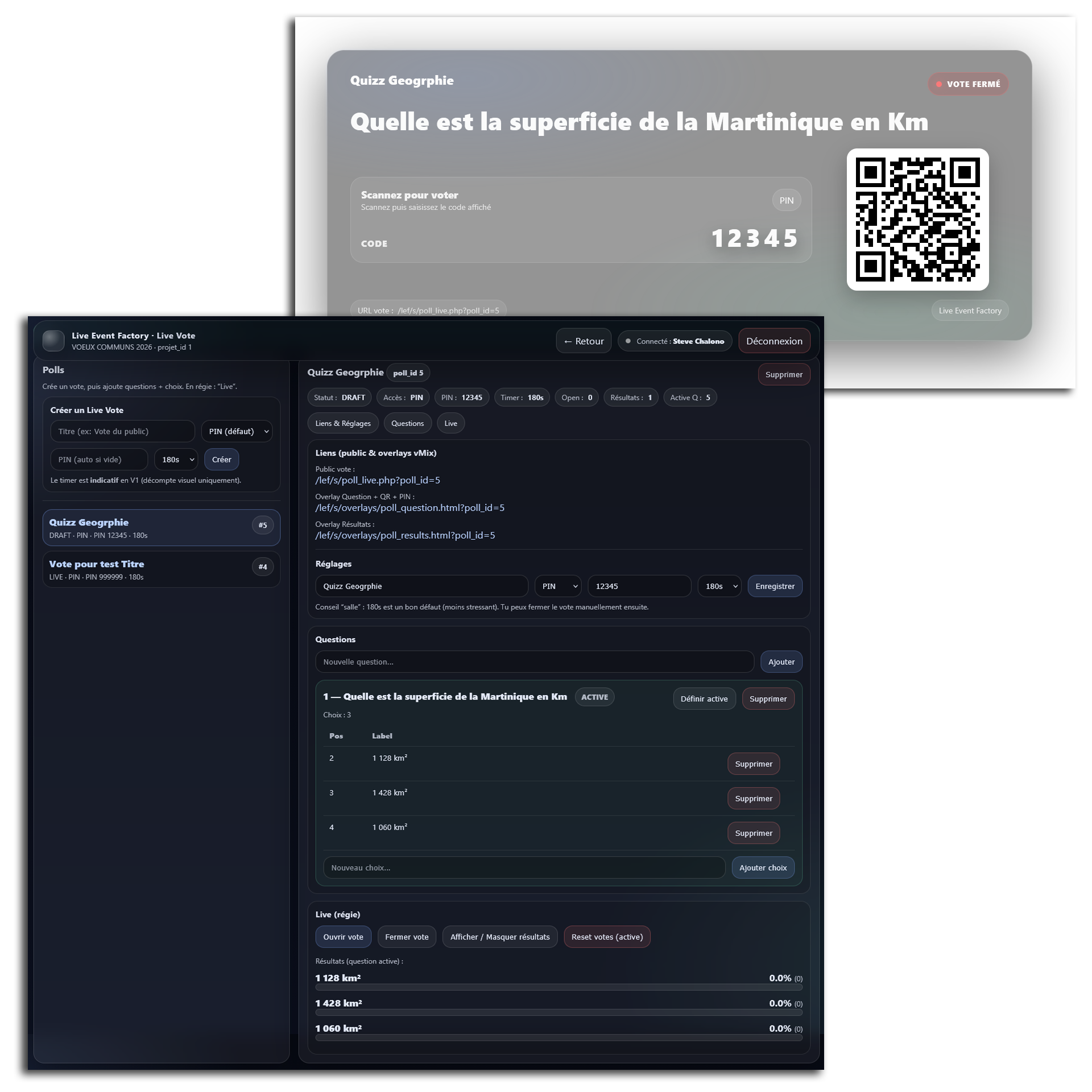 Avec Live Vote, le module de sondage temps réel de Live Event Factory, vous faites voter votre public en quelques secondes via un QR code et un PIN unique, avec des résultats immédiatement affichables.