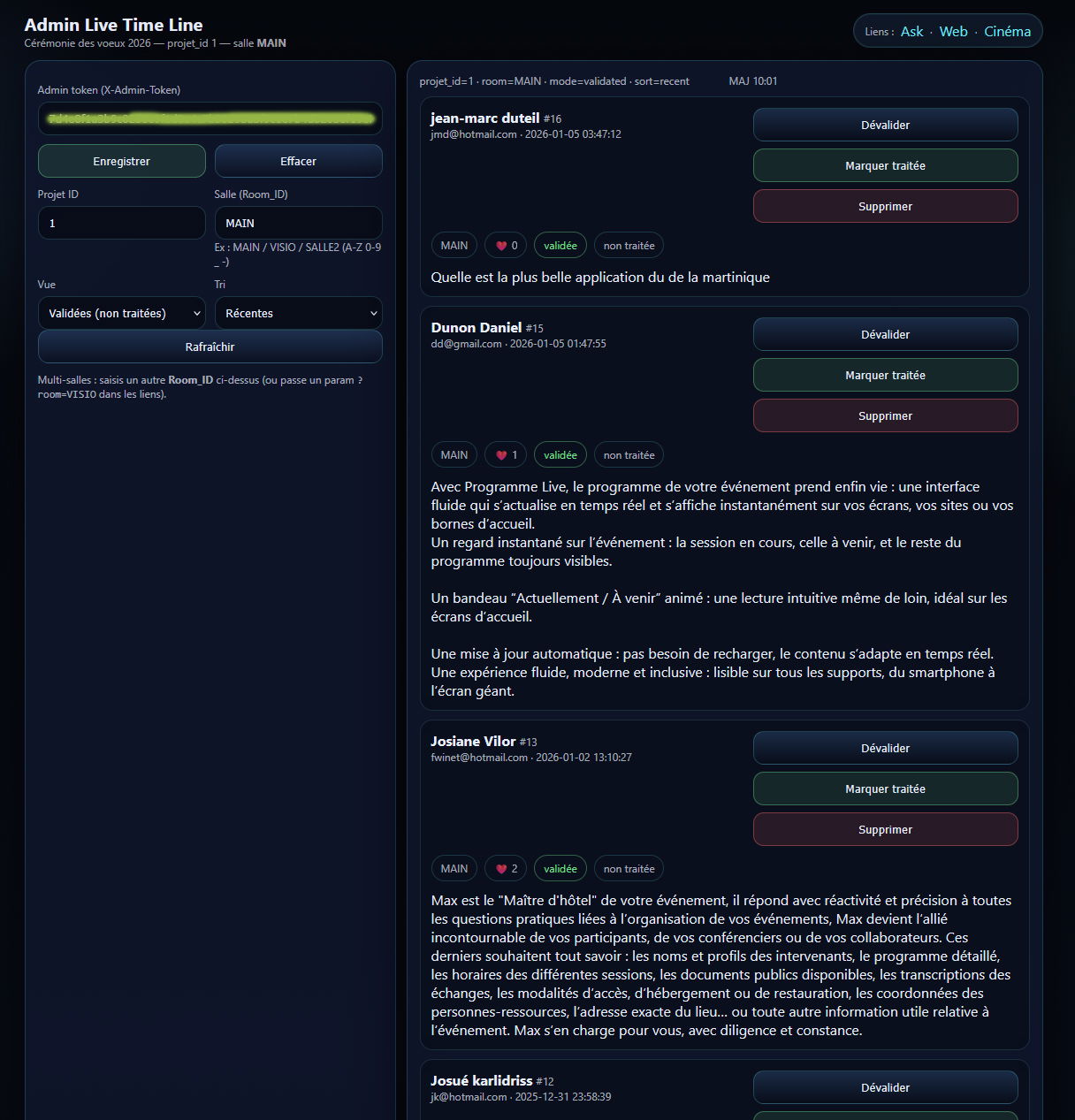 Les messages apparaissent dans une timeline modérée, permettant à l’équipe de régie ou au modérateur de prioriser les interventions les plus pertinentes et d’alimenter le débat en direct.