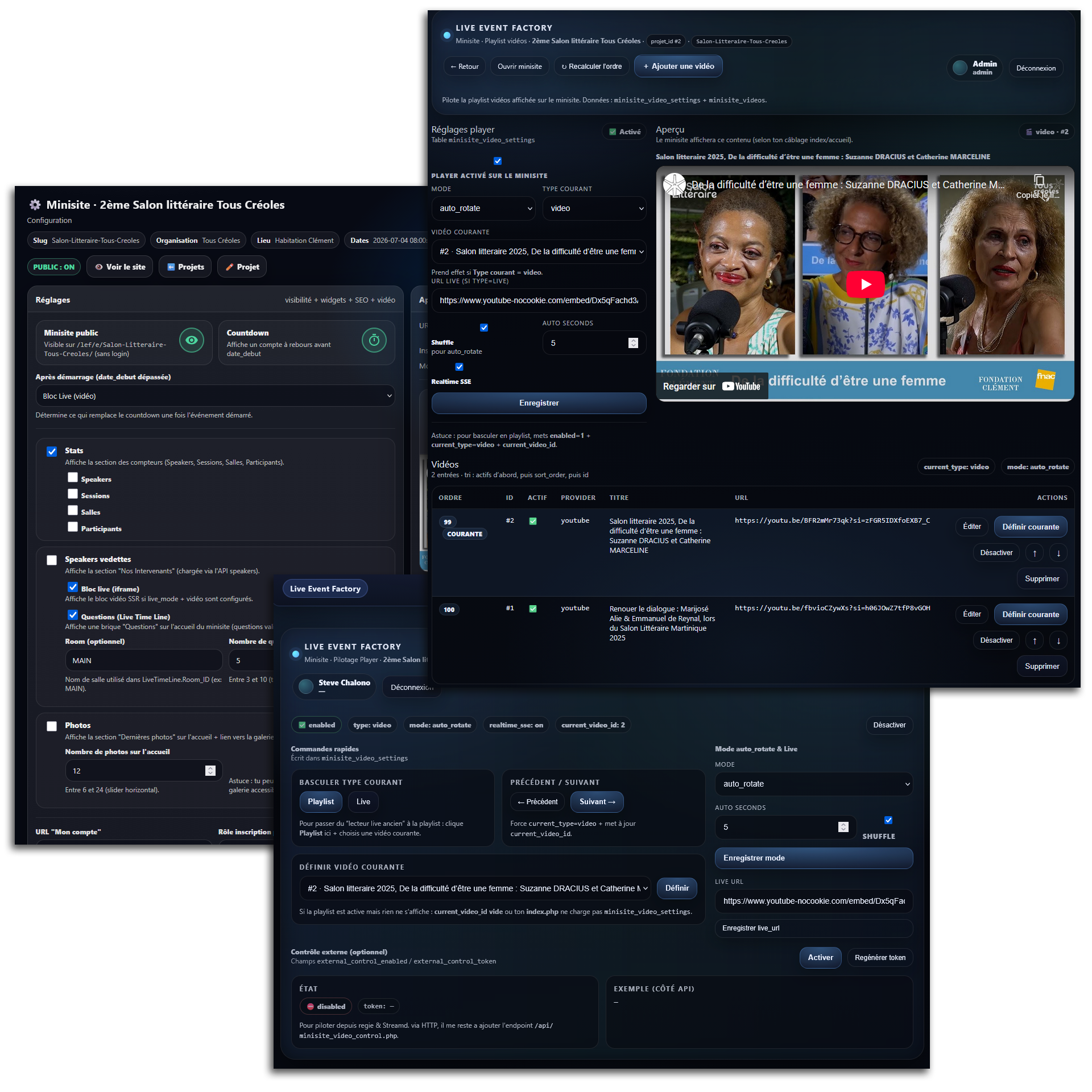 Le tout dans une architecture SaaS, sécurisée par callback et intégrée à l’écosystème complet Live Event Factory. (check-in, minisite, diffusion vidéo, overlays live, exports régie).
