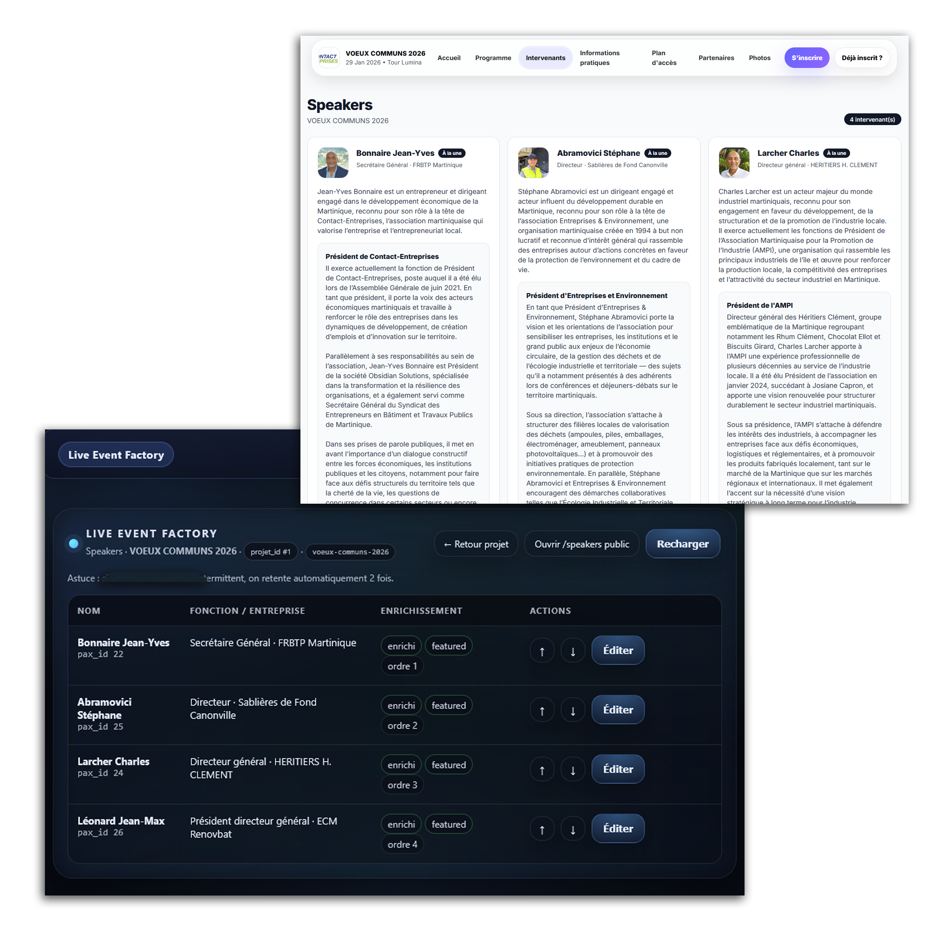 Avec le module Speakers de Live Event Factory, chaque intervenant est mis en valeur comme il le mérite : photo, biographie claire, rôle dans l’événement, ordre d’apparition maîtrisé, mise à jour en temps réel… tout est pensé pour renforcer leur crédibilité et donner envie d’assister à leurs interventions.